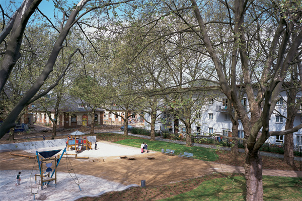 Die gelungene Konversion der ehemaligen Michael-McNair-Kaserne im Frankfurter Stadtteil Höchst zeigt, dass auch im öffentlich geförderten Wohnungsbau Maßstäbe in zeitgenössischer Architektur gesetzt werden können. Die parkähnliche Grünanlage und ein Nutzungskonzept, das der Individualität der Mieter und dem gemeinschaftlichen Miteinander viel Raum bietet, sorgen für hohe Wohnqualität.